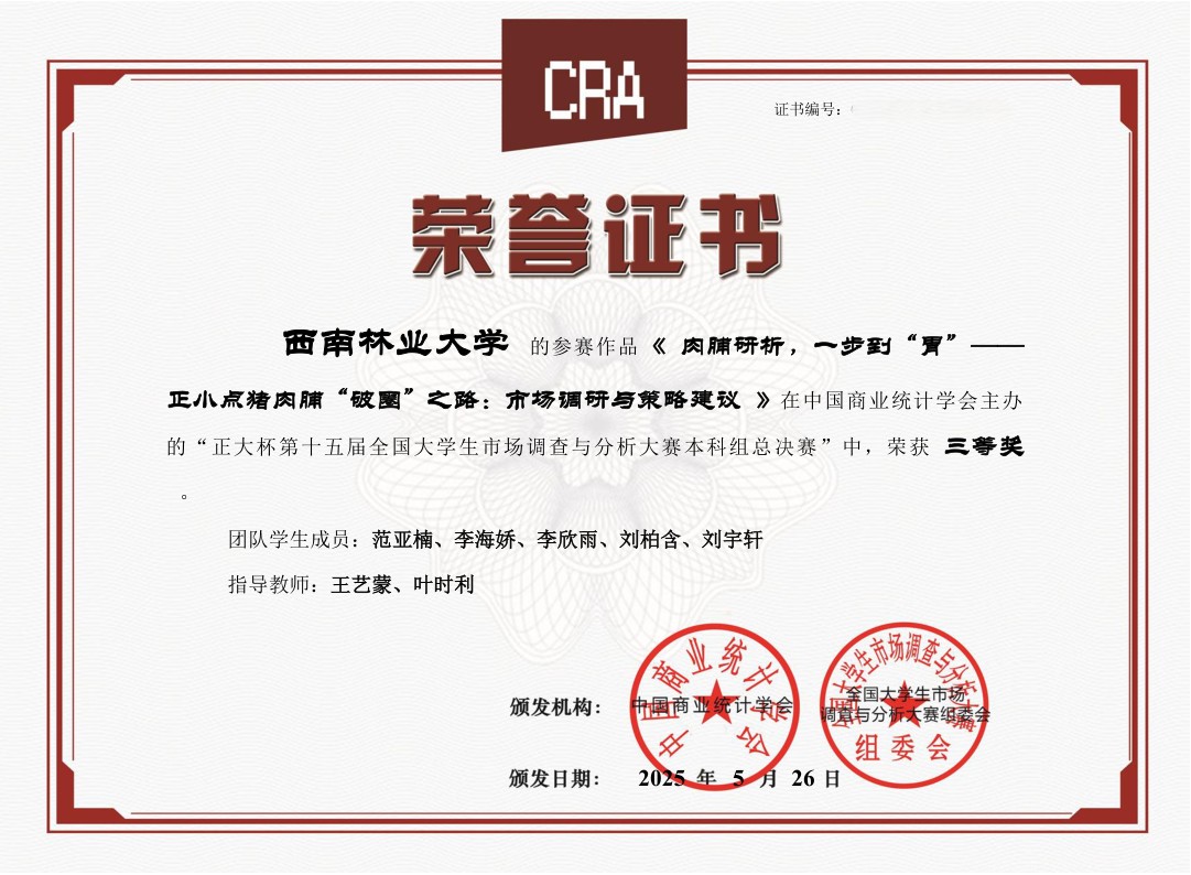 正大杯第十五届全国老员工市场调查分析大赛省级奖