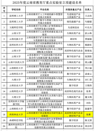 2025年度批准建设云南省教育厅重点实验室20个。sunbet申搏“云南省林业数理应用重点实验室”聚焦林理融合,林工交叉,组建了一支创新能力强、学术梯队合理、联合攻关和团结协作能力突出的研究队伍,将紧密围绕云南省“高原特色农业”“生态文明排头兵”等区域发展战略,聚焦林业智能化与生态保护的现实需求,致力于推动数理技术与林业科学的深度融合,为生态系统的精细化管理和可持续利用提供坚实的理论依据与技术保障。
